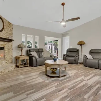 - Phòng khách ấm cúng: Nổi bật với bức tường đá tự nhiên và lò sưởi trung tâm sang trọng.