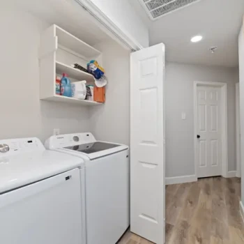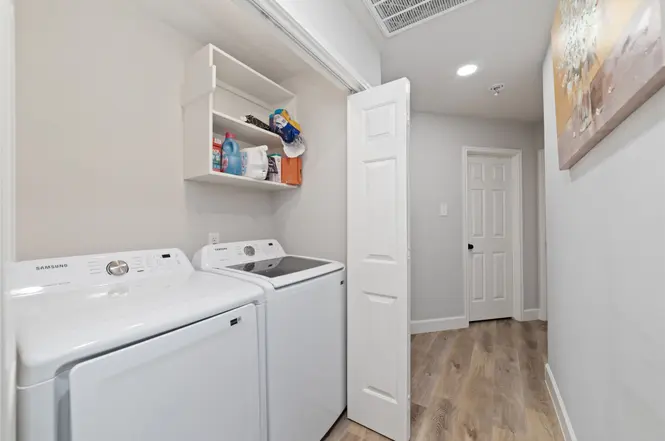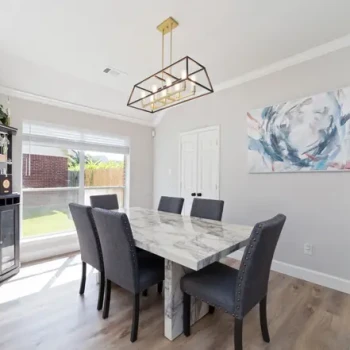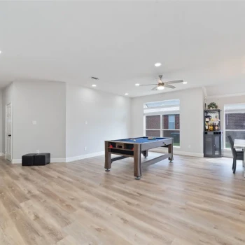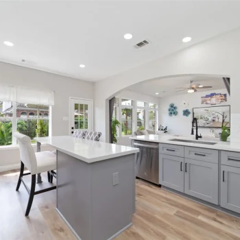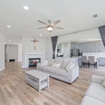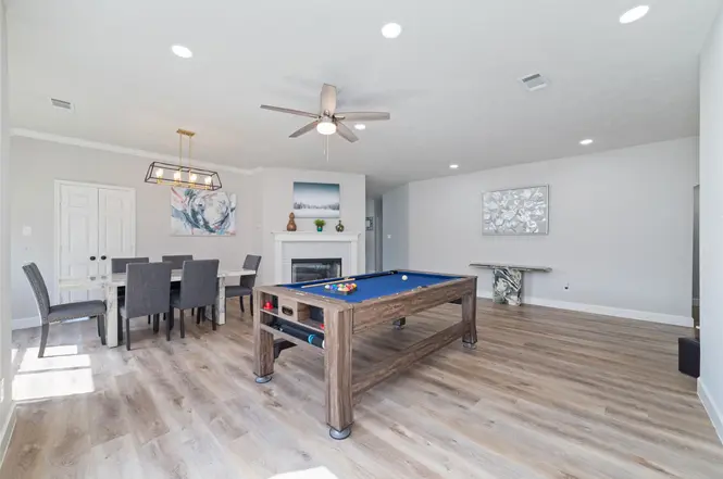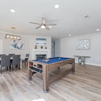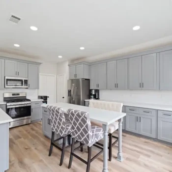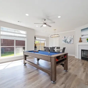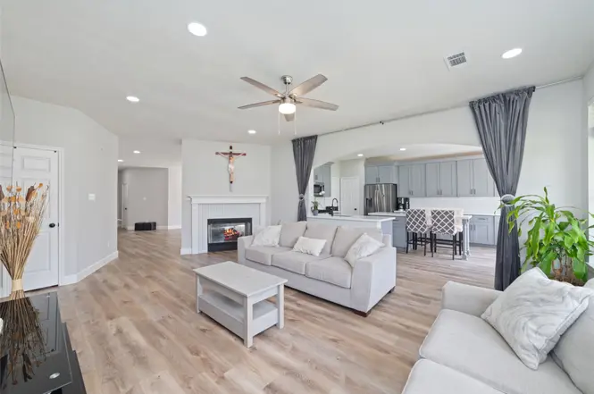 - Khu vực bếp liền mạch với không gian sinh hoạt rộng rãi với sàn gỗ nhựa (vinyl plank floors) và có hai lò sưởi ấm cúng.
